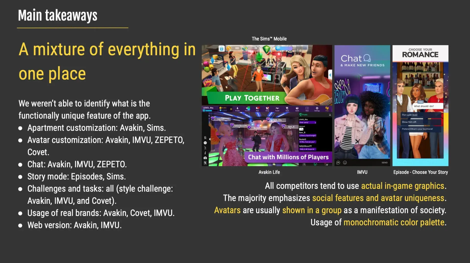 Comparison of features from Avakin Life and other apps like Sims and IMVU, highlighting social features, apartment customization, and avatar uniqueness in the app competition summary.