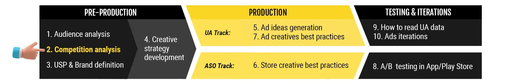 Diagram outlining the process of competition analysis as part of the creative series, focusing on strategic pre-production phases for mobile game growth and app store optimization.