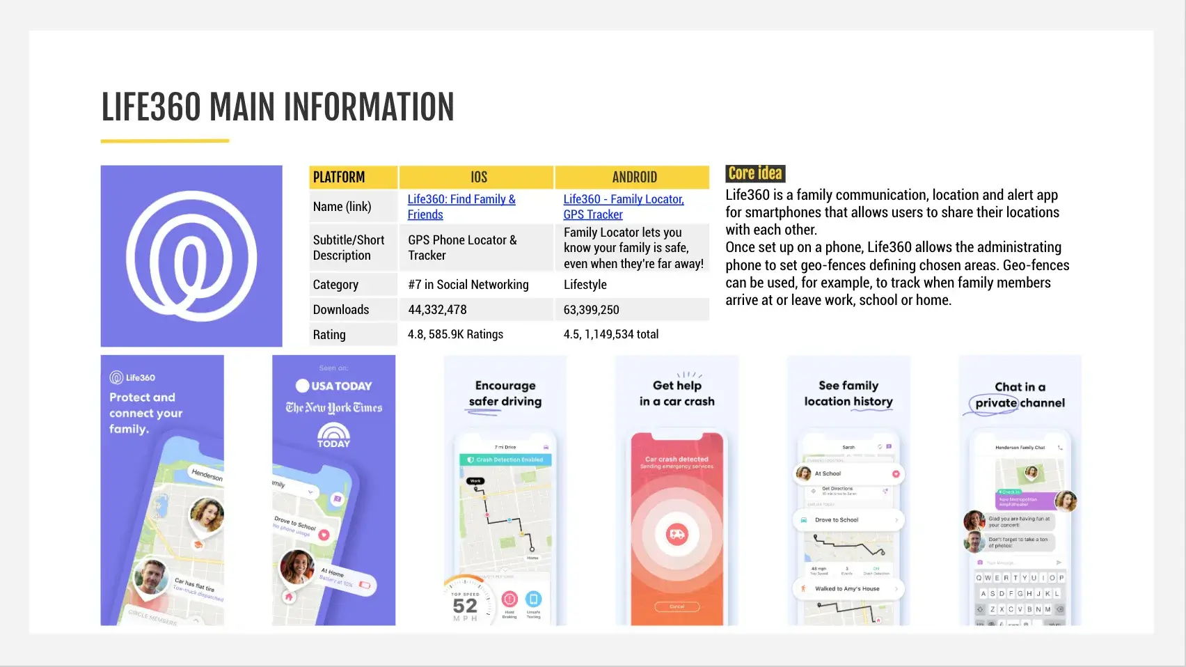 A detailed competitor analysis of Life360 app showing its core idea of geo-fence tracking for families, along with its rankings and download statistics on iOS and Android platforms.