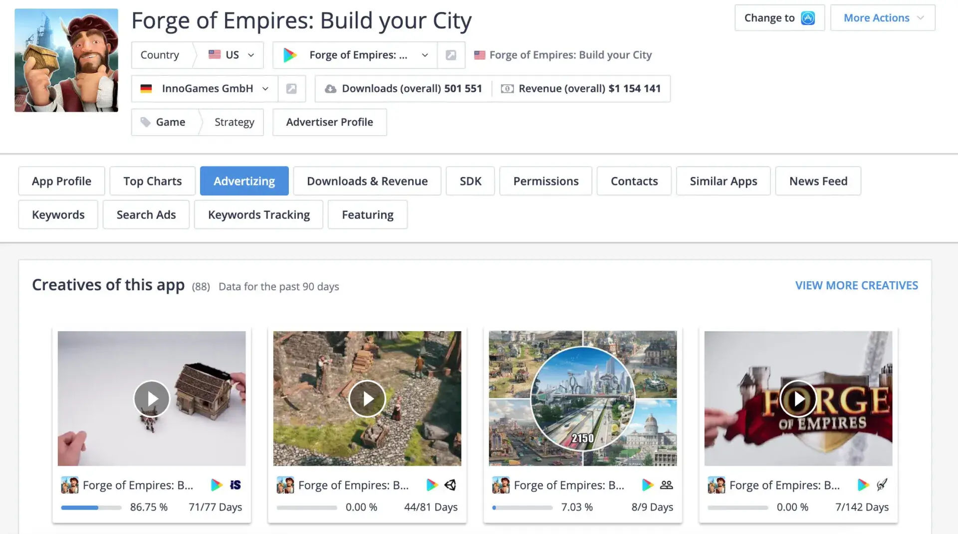 Here’s an example: In the Apptica screenshot below, you’ll notice a cinematic building ad that is responsible for nearly 87% of the impressions tracked for Forge of Empires, a game developed in Hamburg. This particular ad seems to be the best-performing one for the developer. For more valuable insights about this ad, you can watch Mobile Ad Eaters Episode 3, featuring Fabian Weiske from Innogames.