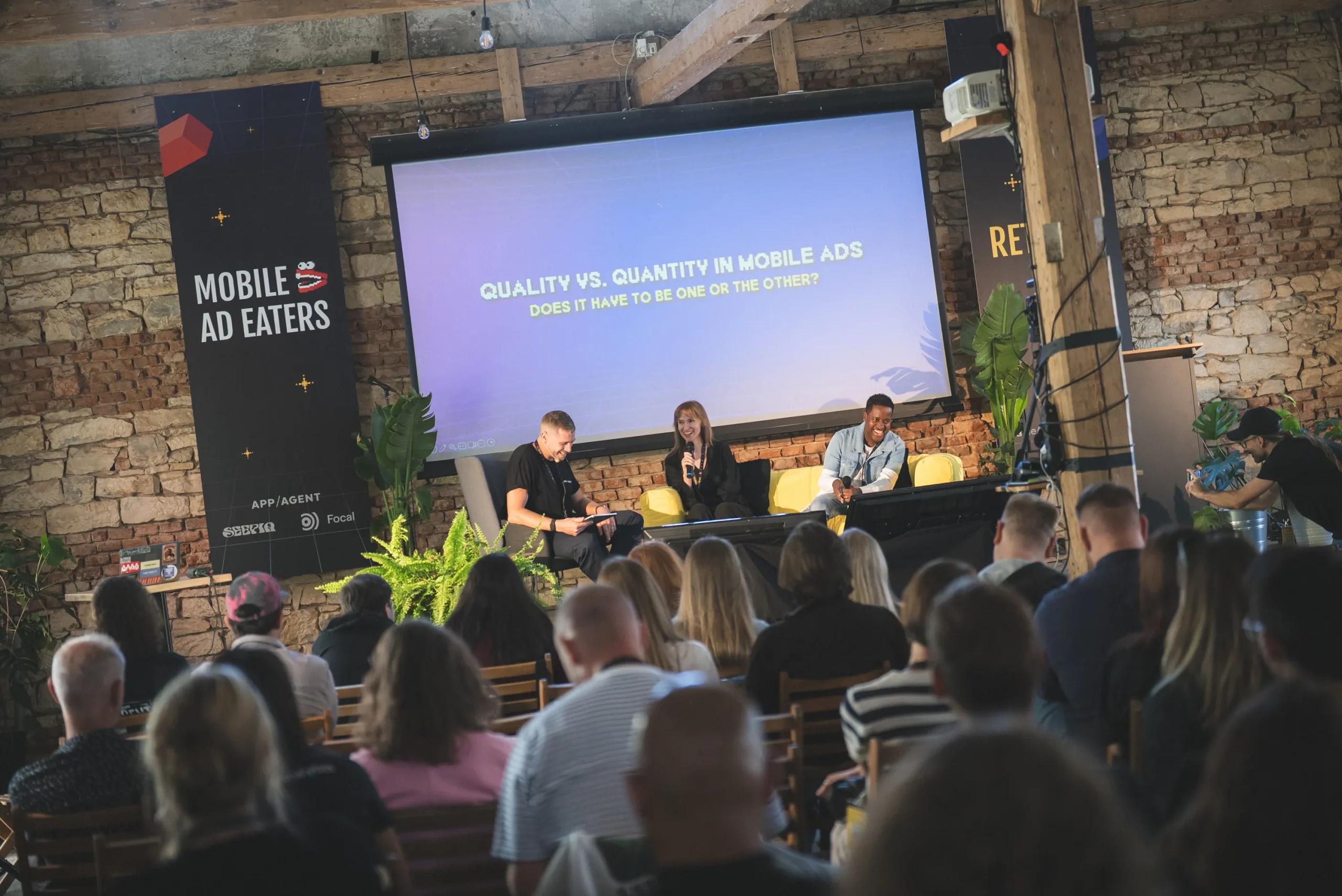 Panel discussion at Mobile Ad Eaters Retreat 2025 on quality vs. quantity in mobile ads featuring experts from AppAgent, Tactile Games, and Voodoo.