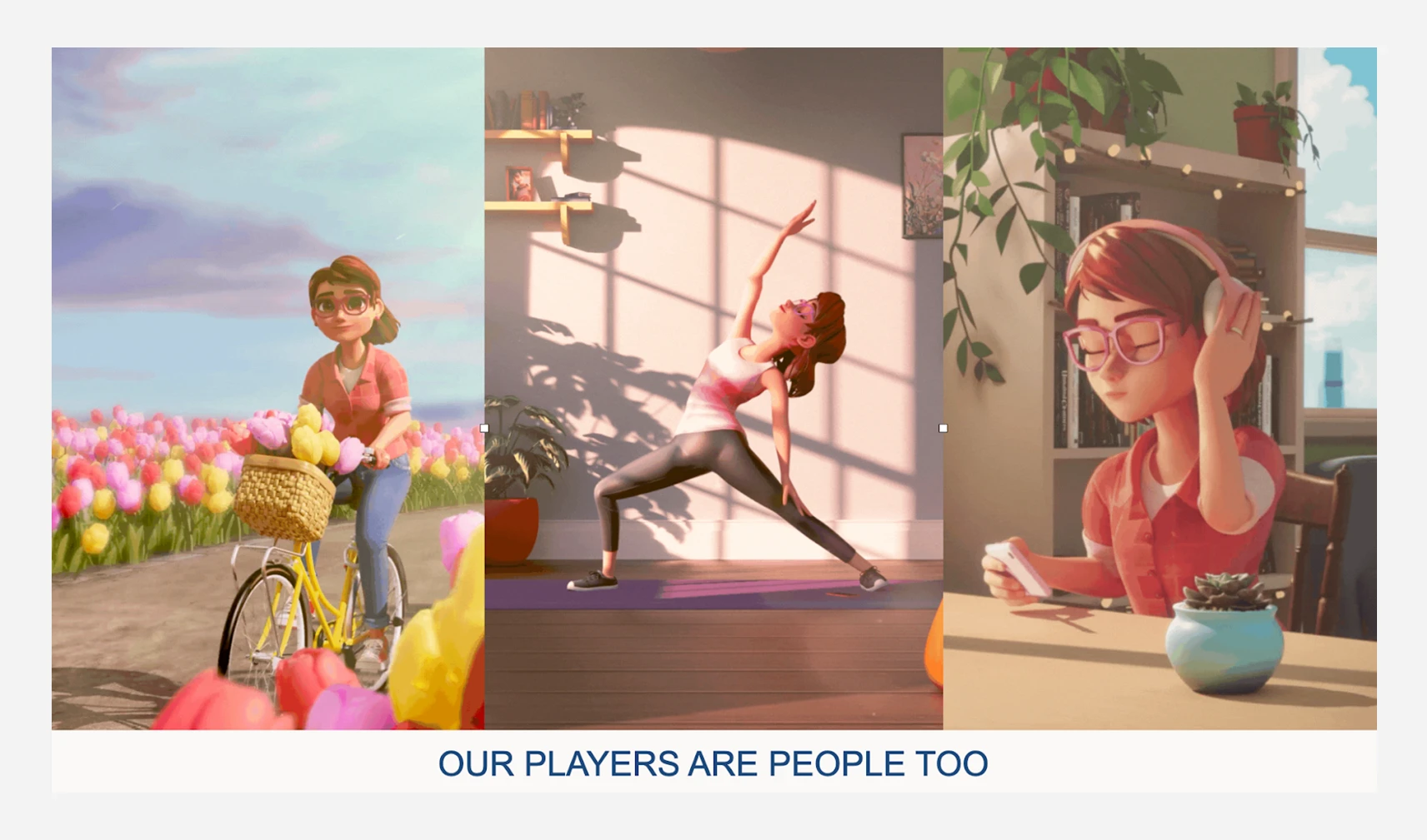 Game characters depicting real-life player moments—cycling, yoga, and music—reinforcing human-centered creative storytelling in mobile gaming.