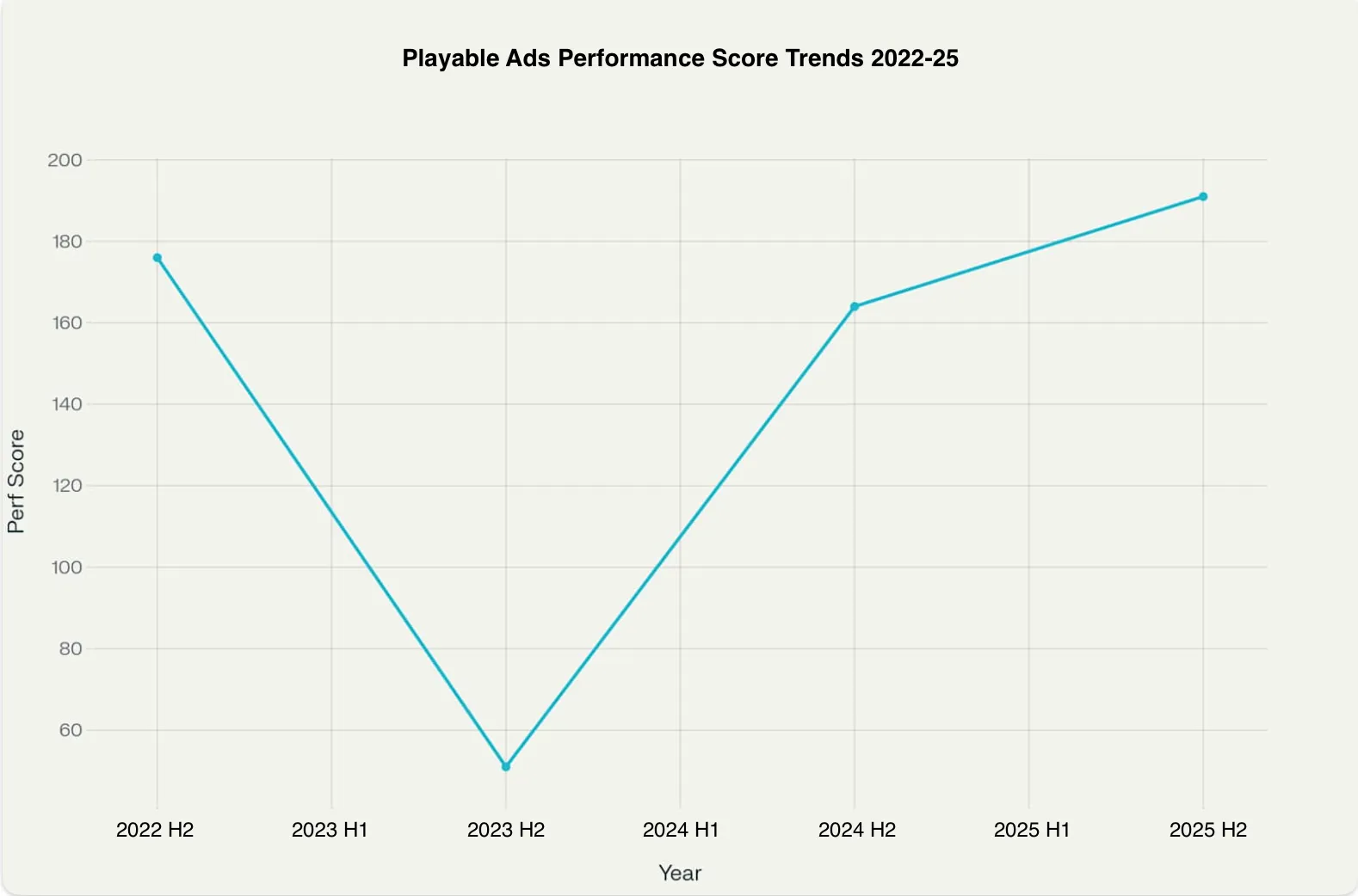 Annual performance scores showing playable ads recovery and growth, reaching the highest performance in 2025.