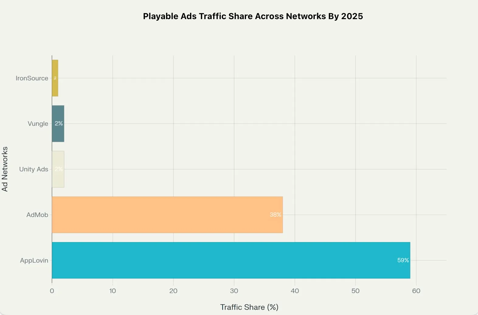 - AppLovin (59% traffic share): Best for testing new concepts and scaling proven winners